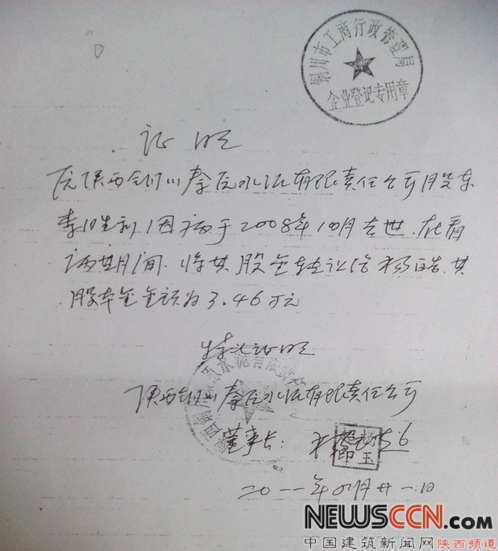 而記者在孫文學(xué)、常欽志等人提供的銅川市工商行政管理局的備案資料中關(guān)于李勝利的股權(quán)轉(zhuǎn)讓僅僅是一份楊玉超出示的證明材料,并沒有其他關(guān)于李勝利轉(zhuǎn)讓股權(quán)的協(xié)議。