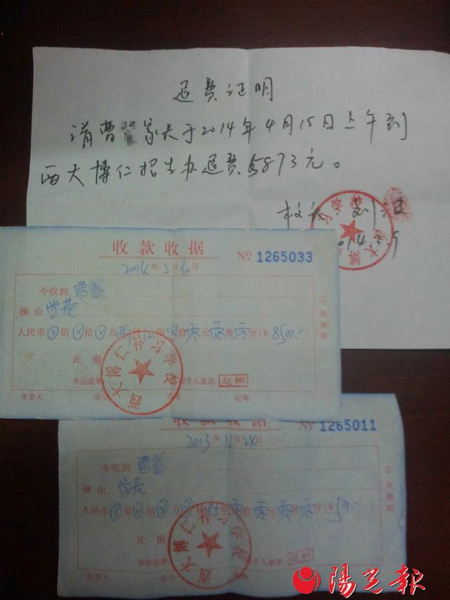隨后,曹師傅找到了學校的校長,想要給孩子辦退學,學校校長同意了,并給他開了一張“退費證明”,讓曹師傅在4月15日去學校辦理退費5873元。
