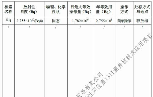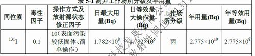 西安摩科興業(yè)石油工程技術(shù)有限公司擬新增放射性同位素131I年用量為2.775×1010Bq/a,一般每支釋放器中同位素131I的活度約為2.96×107Bq,根據(jù)企業(yè)提供資料,日最大操作6只釋放器,該企業(yè)日最大用量約為1.782×108Bq。