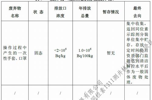 放射性同位素測(cè)井過(guò)程中,釋放器操作人員必須佩戴手套和口罩,這些用品可能會(huì)受到污染成為放射性固體廢物,按每次測(cè)井使用1雙手套,1只口罩,約0.1kg全年產(chǎn)生量約46.8kg,按照合同約定交由中國(guó)石油集團(tuán)測(cè)井有限公司生產(chǎn)測(cè)井中心處置。