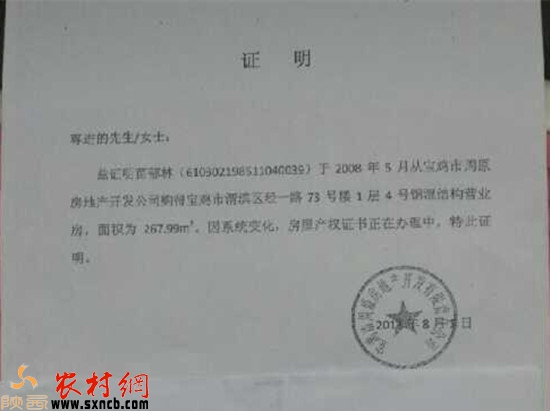 2013年8月1日給苗郁林出具苗郁林購(gòu)房和房屋產(chǎn)權(quán)證正在辦理中的證明。