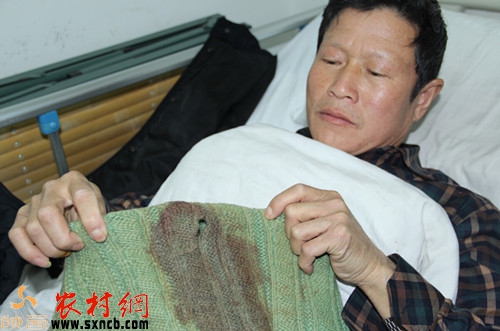 農(nóng)民工姚銀貴拿起被捅破的衣服