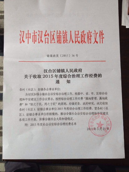 漢中一鎮(zhèn)政府收"綜治費(fèi)" 最高達(dá)5000最低800