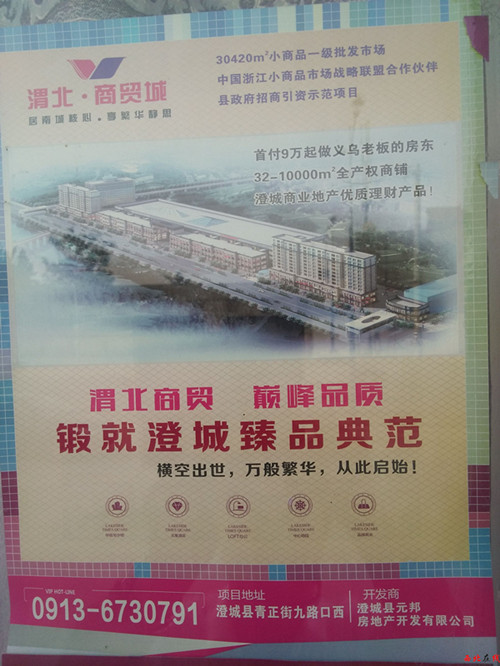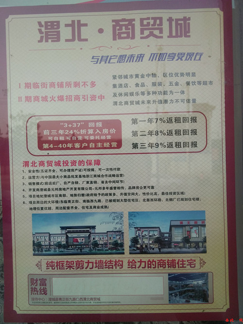 2015年6月9日,記者在知情人引領(lǐng)下,來到位于澄城縣九路與青正街交匯處的“渭北商貿(mào)城”建設(shè)處,看到正在建設(shè)了兩層的樓房。在售樓部,記者發(fā)現(xiàn)其沒有懸置一個合法證件。經(jīng)了解得知,此處號稱“占地72.21畝,建筑面積97341m2”、“政府重點工程”、“澄城縣實施商貿(mào)名縣建設(shè)的戰(zhàn)略舉措”,似乎煞有介事。