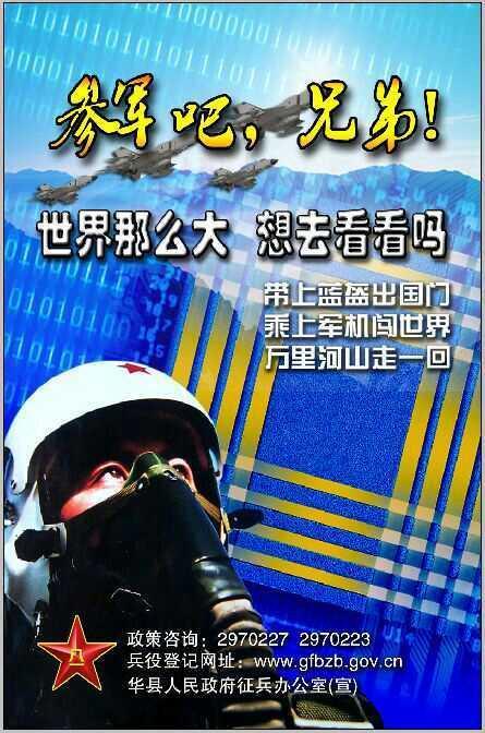 更具特色的是,該組宣傳畫配有極具網(wǎng)絡特色的宣傳語,包括“世界這么大,想去看看嗎?開上軍機闖世界、乘上軍艦去遠航,萬里河山走一回。”還有“有你國更強!從軍報國、舍我其誰;民族復興,熱血擔當”等。同時,宣傳畫上還印有政策咨詢電話、兵役登記網(wǎng)址及二維碼,通過微信掃描后即可關注“華縣人民武裝部”官方微信平臺,可在線咨詢等。