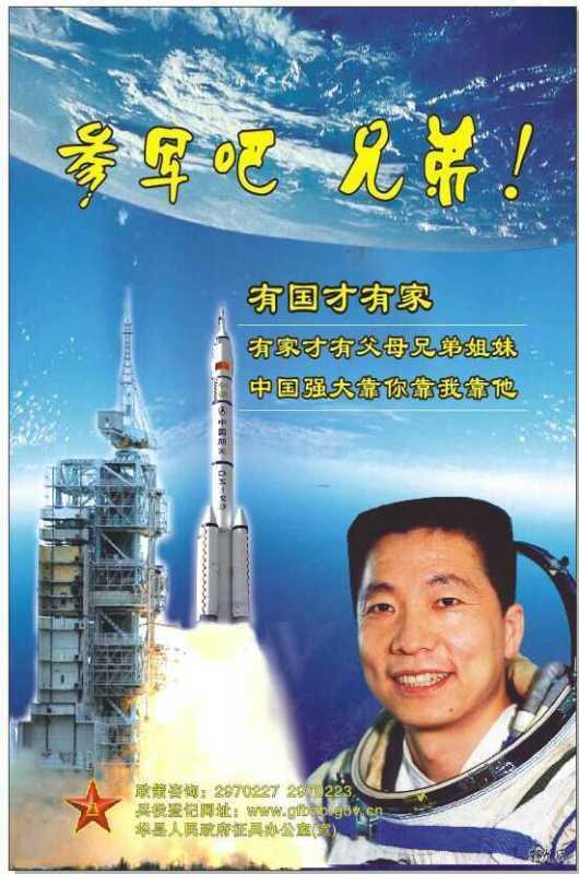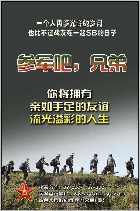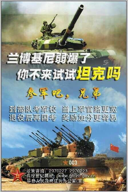 “蘭博基尼弱爆了,你不來試試坦克嗎?參軍吧,兄弟!到部隊考軍校,當上軍官路更寬,退役后再國考,獎勵加分更容易。”這是陜西省軍區(qū)渭南軍分區(qū)華縣人民武裝部今年征兵宣傳畫其中的一幅,而配圖是威武的坦克在硝煙彌漫的戰(zhàn)場快速前行。華商報記者發(fā)現(xiàn),華縣人民武裝部今年的征兵宣傳畫共9幅,內容包括戰(zhàn)士負重匍匐前行、高原上武裝越野、駕駛戰(zhàn)機翱翔藍天等,背景配圖不但有滿臉汗水的戰(zhàn)士表情特寫,還有部隊在高山、雪原間武裝行進的大場面。