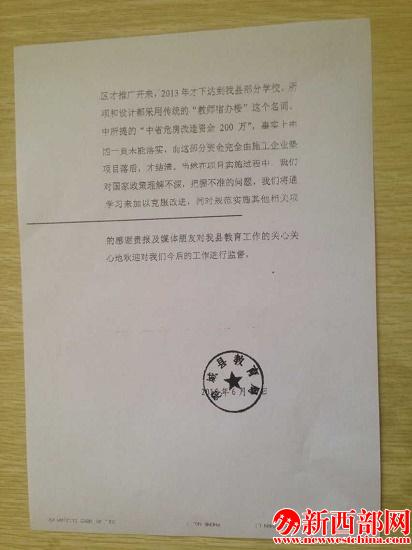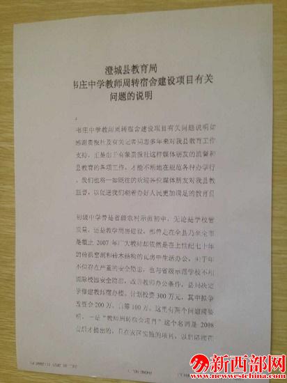 隨后記者又來到澄城縣教育局,在局紀檢委書記的指引下,記者見到了該局勤工辦王老師。王老師告訴記者,局里具體負責學校工程建設(shè)的同志下鄉(xiāng)去了,他前些年曾參與過有些學校的建設(shè)工作,并介紹說,韋莊中學早些年校舍一直比較陳舊,2007年曾申報過改造項目,但當時國家沒有危房改造項目這種說法,所以未能申報成功,但校方自籌資金解決了教師宿辦樓。自2008年汶川大地震后,國家加大了對農(nóng)村校舍危房改造力度,學校這才成功以教師周轉(zhuǎn)房的名義向縣財政申請到了272萬元財政支持,這些錢用于支付了前面的教師宿辦樓工程款,但后面的教師周轉(zhuǎn)房卻由于資金問題沒有動工,具體到賬及支付情況他不清楚,局里財務(wù)具體經(jīng)辦。