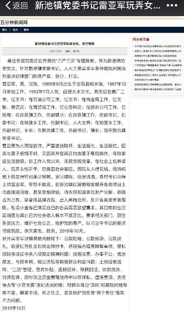 雷亞軍為人陰險狡詐。嚴重道德敗壞、生活腐化、生活糜爛。因其與妻子感情不好,又因其升官高遷均由妻子幕后操作,導致家庭生活狼狽。自工作入黨以來,無視黨規(guī)黨章,在社會上包養(yǎng)情人、玩弄女性若干,已報復社會家庭。因玩女人得花錢。經(jīng)濟問題上就顯得特別齜牙咧嘴。貪污腐敗,收受賄賂。各村書記均得上供雷亞軍,有怒不敢言。在新池鎮(zhèn)紅提葡萄發(fā)展等各類項目上均直接或間接、甚至變相撈錢,將農(nóng)民和國家的財產(chǎn)分解、吞噬占為己有。穿奢侈品牌衣服,出入高檔會所。亂開各類發(fā)票做假賬。私設(shè)小金庫已滿足自己的各類罪惡欲望需求。其目前的生活高調(diào)度與其自己的社會收入根本不成正比。要求相關(guān)部門,頂住各類壓力、維護社會公正、維護黨的尊嚴。以習近平書記的要求徹查到底。誅滅害蟲、敗類。2015年10月。