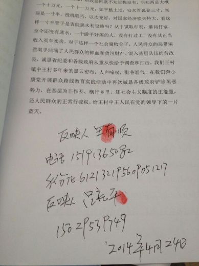 為了能夠盡快的蓋房子,王有順找過(guò)鎮(zhèn)級(jí)各位領(lǐng)導(dǎo)反映呂平周的違法違紀(jì)的事實(shí),歷時(shí)一年多,始終沒有處理結(jié)果,舉報(bào)信投出后石沉大海,無(wú)人問(wèn)津。后來(lái)王有順又跑去西安見到了陜西第七巡視組的同志,他們親自接了王有順的舉報(bào)材料,原以為終于可以懲治惡人村長(zhǎng),還村民一個(gè)安寧?烧l(shuí)曾料到,巡視組竟將舉報(bào)材料轉(zhuǎn)至合陽(yáng)公安局王村鎮(zhèn)黨委及相關(guān)部門,其聽以沒有結(jié)果。有關(guān)人士告訴記者,王村鎮(zhèn)黨委書記王改對(duì)這件事情一直遮遮掩掩,欺上瞞下,試圖不了了之。2015年在王有順多次催問(wèn)合陽(yáng)縣紀(jì)委及有關(guān)部門后,王村鎮(zhèn)黨委書記王改竟把實(shí)名舉報(bào)的有關(guān)違法事例以信訪案件對(duì)待。最可氣的是王村鎮(zhèn)黨委書記王改指派一名副鎮(zhèn)長(zhǎng)面見王有順,立逼要王有順寫下息訴罷訪的承諾書后,才解決王有順個(gè)人現(xiàn)實(shí)生活中的基本生存,生活問(wèn)題。遭到拒絕后,又安排該司法所的同志作王村村主任呂平周的工作,未果,該鎮(zhèn)司法所同志以一句無(wú)能為力告知王有順。王有順再次上訪王村鎮(zhèn)黨委一連數(shù)月,鎮(zhèn)黨委書記王改避而不見,這讓王有順投訴無(wú)門,倍感無(wú)助無(wú)望。