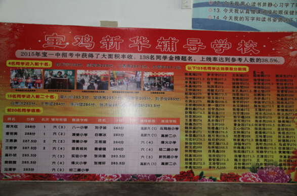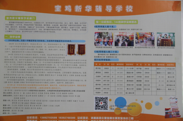 新華輔導學校為1998年8月由寶雞市教育局批準創(chuàng)建的專業(yè)從事中小學階段文化課程課外輔導學校(辦學許可證號:161030270000391)。十八年來,學校始終堅持“緊貼基礎、循序漸進、啟迪思維、融會貫通”的教學思想和“保證質量、誠信辦學、良心育人、服務家庭、奉獻社會”的辦學理念,不斷創(chuàng)新教學思想、教學模式,不斷加大基礎投入,改善辦學條件,打造強有力的教師團隊,扎實提高學校的管理水平和專業(yè)能力,促使教學質量不斷提高,使學校年年邁新步,年年上臺階。在這幾年激烈的行業(yè)競爭中,學校仍然在西安各大名校和寶一中小升初、初升高招考中獲得大面積豐收,上線率連年固定在38%左右。