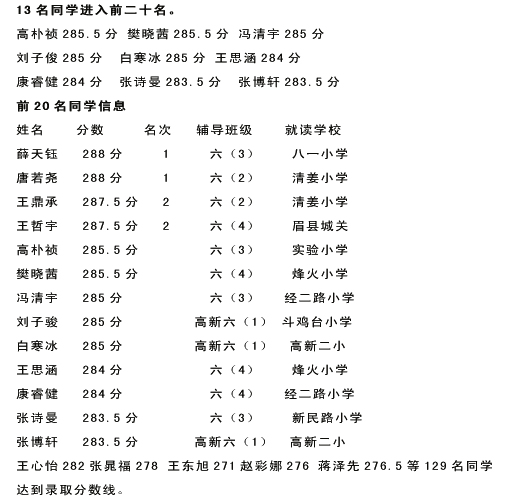 其中4名同學(xué)進(jìn)入前十名。薛天宇288分、唐若堯288分、王鼎承287.5分、王哲宇287.5分