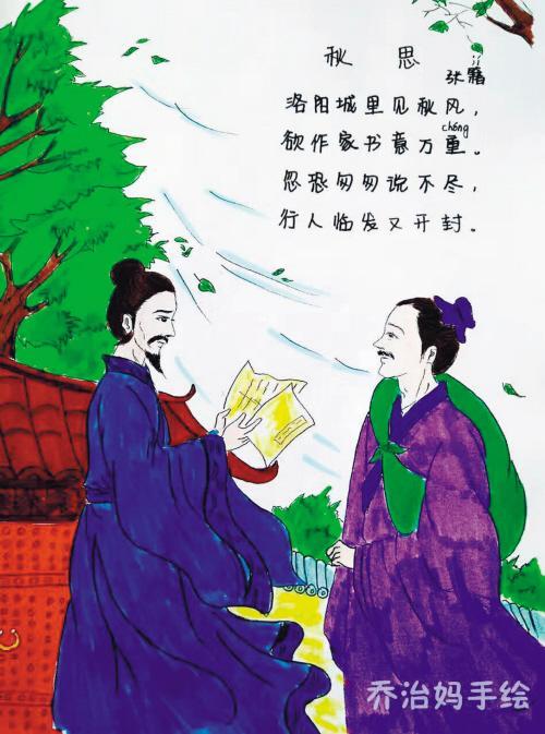 很多古詩都沒有有趣的解釋和圖片說明,為何不能在學(xué)習(xí)古詩的時候畫出詩文描述的場景呢?喬治媽開始為《秋思》配圖。喬治媽畫作中,抓住了秋風(fēng)這個重點,畫作中秋風(fēng)不但吹搖了樹枝、吹落了葉片,更吹蕩起詩人的衣袖。畫中藍(lán)衣是詩人張籍,紫衣身負(fù)包裹的就是將要回鄉(xiāng)的友人。