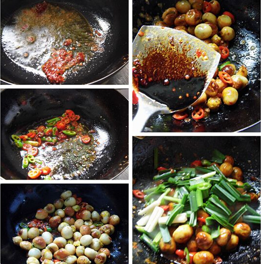鵪鶉蛋500克,蒜苗2根,青尖椒1個(gè),紅尖椒2個(gè)。