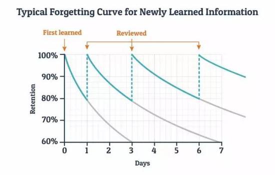 當我們在每一個重要的時間節(jié)點都能夠做到反復的時候,我們則會擁有一條改造后的遺忘曲線:我們可以記住的東西越來越多,直至接近100%。