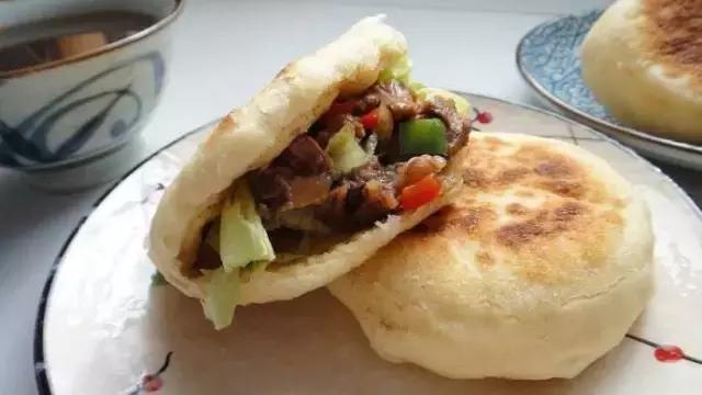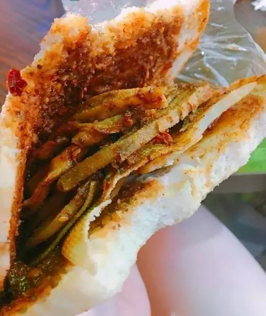 菜夾饃有的是用燒餅夾,有的是用荷葉餅夾,里面除了菜,還可以?shī)A煎蛋、鹵蛋。雖然沒(méi)肉,但是依然香死人。