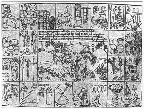 上述這幅圖這是1470年在紐倫堡印制的一幅與結(jié)婚有關(guān)的版畫。圖畫的正中部位描繪了一位男子向結(jié)婚對象贈送戒指的姿態(tài)。圖中左側(cè)是男方為結(jié)婚而準(zhǔn)備的各類家具和用具,右側(cè)則是女方的?梢钥吹剑蟹綔(zhǔn)備的主要是武器、馬、馬具、農(nóng)具;女方準(zhǔn)備的主要是家具、繞線棍、雞蛋、奶酪等。這些物品在《薩克森法典》中均有描述,根據(jù)當(dāng)時的法律和圖畫,可以知道贈送結(jié)婚戒指的習(xí)慣已經(jīng)形成了。