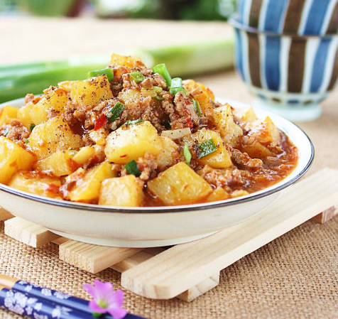 1.土豆去皮,洗凈后切成約1厘米見方的小丁,再放入清水中洗去多余的淀粉,撈出瀝干;豬肉洗凈剁碎成末,加入適量的蠔油、淀粉,拌勻腌制15分鐘;郫縣豆瓣剁碎,生姜與大蒜切成末;將適量的蠔油、淀粉、鹽、生抽放入小碗中,加入少許高湯或清水,拌勻成調(diào)味汁。