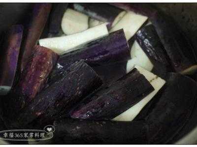 第三步:鍋中加入適量的清水,煮沸,翻入茄子,煮軟,約3分鐘。