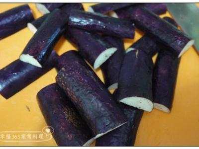 第二步:茄子洗凈后切去頭,切蒂,先切長段,然后再對半切開。