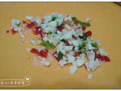 第五步:將蒜頭去皮,與辣椒一起切細(xì)末。