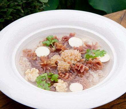源于唐代,原名叫“攢雙丞”,影射武則天當(dāng)政時?扛婷芎蛧(yán)刑逼供而臭名昭著的尚書左丞周興和御史中丞來俊臣的。當(dāng)時廚師因恨“雙丞”而創(chuàng)此菜。以豬肚頭、雞肫為主料,配以核桃仁和口蘑汆制而成,脆嫩鮮美,香色誘人,是高級筵席的上乘湯菜。