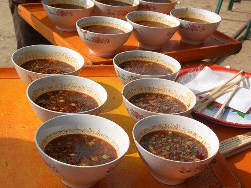 此地民風(fēng)溶關(guān)中的淳樸與塞外的豪放于一體。飲食亦樸拙豪放,大氣渾成,最具特色的當(dāng)屬本地獨一無二的“血條湯”。