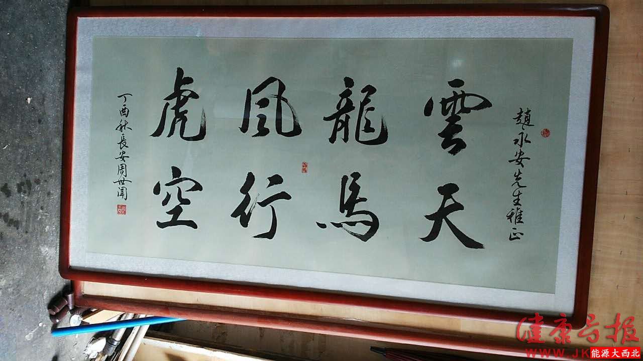 略加沉吟后,周先生首先講述了自己練習書法的大致經(jīng)歷和鉆研書法藝術近二十年來的一些切身感悟。一旁的媒體朋友也穿插著介紹周先生,至此,筆者也熟知了他的情況:周先生自幼苦練書法,對于歷朝歷代名家的名碑珍帖悉心揣摩、刻苦鉆研,以超出常人的悟性、池水盡黑的刻苦精神,外師造化,中得心源,幾十年焚膏繼晷,數(shù)十載夙興夜寐,終于形成了自己“端莊雜流麗,剛健寓婀娜”,雅俗共賞、品位不凡的獨特書風,多年來,他的書法作品在全國各類書法大賽上榮獲金獎,多幅作品或被刻入東坡碑林、梅花碑林等,或被北京至高美術館、陜西工藝美術館等收藏,個人藝術成就被《書法報》《書法導報》《西北美術》等全國上百家各類媒體予以報道。