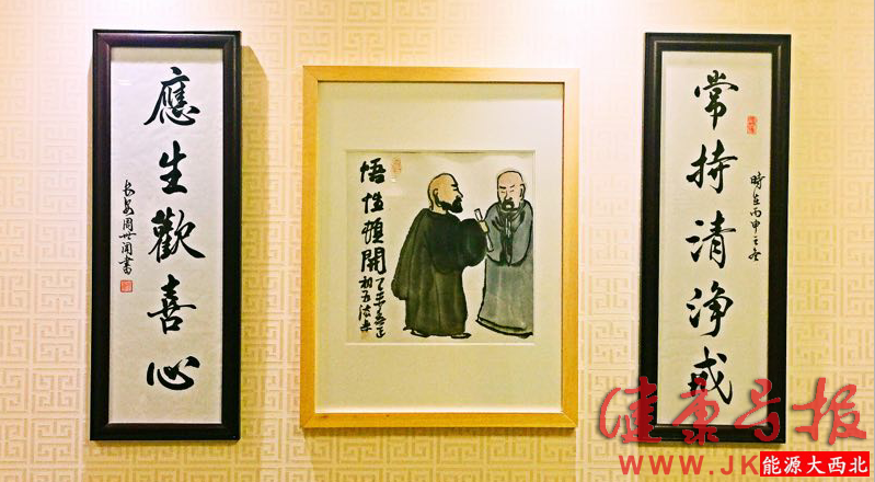 邁步進門,偌大的正廳擺放著近二十多張餐桌,餐廳四周多處都懸掛著由周世聞先生書寫的書法作品。有斗方、有對聯(lián)、有橫幅、有條屏、有扇面,等等不一而足,內(nèi)容多為傳統(tǒng)文化經(jīng)典詞句內(nèi)容。字體多為行書及行草,筆體灑脫飄逸,布局嚴謹工整,內(nèi)容貼合實際。如一幅斗方作品上寫著《論語》里的句子:仁者不憂、智者不惑、勇者不懼。使就餐者在有空閑瀏覽品味到這些書法作品時,有所感悟,多所收獲,因此這些作品充分發(fā)揮了書法作品的文化感染和教化功能。