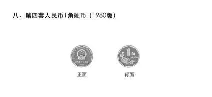 (八)第四套人民幣1角硬幣。其材質(zhì)為鋁鎂合金,正面圖案為國(guó)徽、國(guó)名、漢語(yǔ)拼音國(guó)名、年號(hào),背面圖案為菊花、面額。