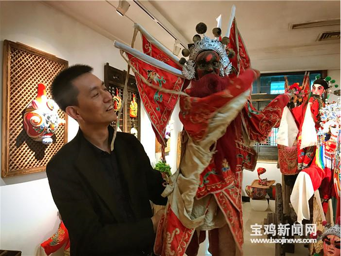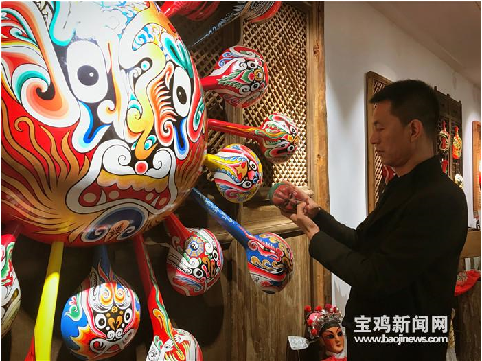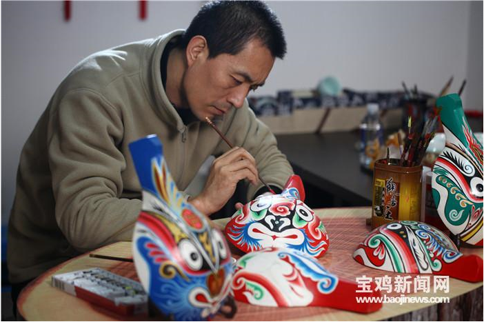 社火臉譜藝術(shù)是寶雞非物質(zhì)文化遺產(chǎn)具有代表性的藝術(shù)形式之一,歷史久遠(yuǎn)、造型奇特、色彩鮮明。陜西省工藝美術(shù)大師、寶雞社火臉譜技藝傳承人薛亞兵,則用獨(dú)特的臉譜和木偶展示了寶雞社火歷史的變遷。薛亞兵時(shí)常從老藝人那收集社火臉譜及木偶。