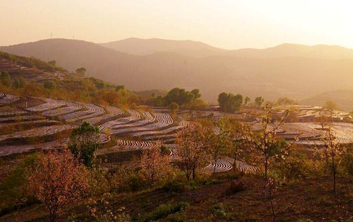 銀絲帶,黃土地,錯把旱田當水梯。夕陽美,翠色飾,山嶺寂靜染金漆。