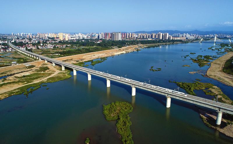 這是一列動車從漢中市漢江大橋上通過(5月7日無人機拍攝)。“5·12”汶川地震時,與四川毗鄰的陜西省漢中市寧強、略陽等縣遭受重創(chuàng)。地震10周年之際,記者再次來到曾經(jīng)滿目瘡痍的災(zāi)區(qū),看到的是漢中城鄉(xiāng)面貌已煥然一新。十年來,漢中市堅持以災(zāi)后恢復重建為契機,攻堅克難,譜寫了經(jīng)濟大發(fā)展、城鄉(xiāng)大變化、民生大改善的嶄新篇章。